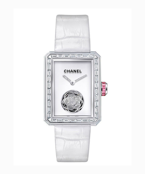 暨2012年CHANEL与爱彼表厂(Audemars Piguet)高级研发部门制表大师Renaud & Papi携手合作推出Première飞行陀飞轮腕表后,进而将飞行陀飞轮机芯搭载至J12,设计出全新J12飞行陀飞轮顶级珠宝腕表;除了以往仅以高科技精密陶瓷呈现的Première Triple Row腕表,回归经典延伸出皮革穿炼款式外,Mademoiselle Privé腕表系列自2012年首度面世以来,不断以各式材质与艺术技法,创造出品牌各式经典元素。去年首度与品牌旗下刺绣工坊Maison Lesage 合作,运用多彩丝线融合针画工艺技术绣制表面,并荣获2013年日内瓦钟表大赏-年度最佳艺术工艺奖,今年Mademoiselle Privé,新款腕表除了既有的珐琅彩绘表现手法外,更加入了珍珠母贝雕刻与23K黄金精雕工艺,立体化的呈现将品牌的腕表精髓发扬光大,也奠定了CHANEL腕表致力于专业制表艺术殿堂的决心。