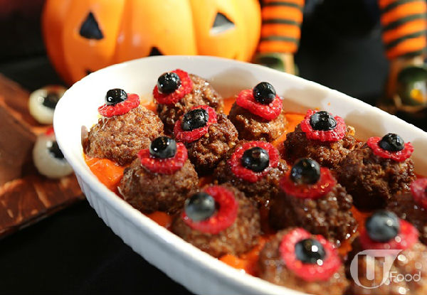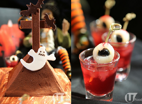 「万圣狂欢」自助晚餐提供多款造型别具心思的万圣节限定美食:火烧牛肉凯撒沙律选用半生熟牛肉片,加添血淋淋之感;呈脑袋形状的椰菜花沙律伴士多啤梨醋;爬满香脆健康早餐穀物条的虫虫茄蓉肉酱意大利粉;浸於血色茄汁中的香辣茄汁肉眼球及浓浓南瓜栗子汤等;甜品方面有鬼怪士多啤梨慕丝、用清甜果肉做成的眼珠洛神花啫喱、可爱小鬼图案万圣节哗鬼曲奇及朱古力慕丝坟墓等,卖相逼真。