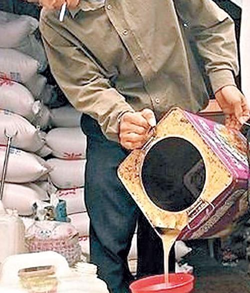 约半小时后,另一偷油党出现,今次是一对中年男女,他们同样乘着三轮车驶至,其中一人打开污水渠盖后,将约一米长的长柄杓子伸入坑渠,使劲地刮,将刮出的地沟油倒进大胶桶。只见胶桶内全是乌黑的胶状液体,且发出阵阵刺鼻恶臭。记者表露身份向他们追问取油原因时,他们未有回应,并立即将胶桶搬回三轮车离去。
