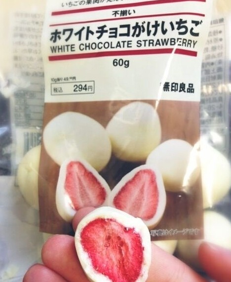 3.少女心爆棚——草莓巧克力 HKD 3*(具体忘记了,不过零食里面算高价)外面是白巧克力,里面是草莓原只果肉。这样的搭配还能不好吃吗。而且日本就是草莓甜品的王国吧……这个属于冬天限定?每次天气冷点的时候才看到有卖。然后都能看到一堆人在扫……