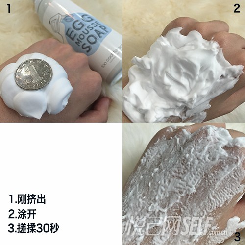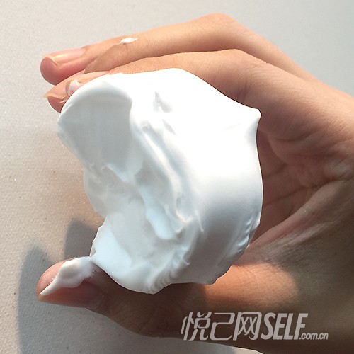 评测结果:产品是慕斯或者是奶油的质地,泡沫很实,十分浓稠。挤出后泡沫造型十分坚挺,可以轻松的托起一元硬币,可以看出密度很高。可能产品触感让人觉得十分厚重,有些油,但冲洗干净后完全没有这个担心的必要。刚挤出看上去很像是弹牙的棉花软糖,也像是打散的鸡蛋清液,产品名字是不是由此得来呢?推开搓揉后不会起更多的虚泡了,三十秒后泡沫会吸收一些,但密度依然很高。