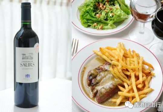 传统的西冷牛扒配招牌秘製酱汁和大量香脆手切薯条分两个部份先后奉上,以确保牛扒能维持理想的温度及肉质。第二部份的牛扒以纯银盘盛载,并置于蜡烛台上为其保温。适逢节日,不妨再点一支CHATEAU DE SAURS葡萄酒,与西冷牛扒完美搭配。