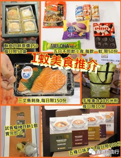 【1蚊美食】1蚊鸡(一元)当然还可以直接买东西吃,必抢的包括1盒12只新西兰有机生蚝,每日限量50盒;冰砖月饼同潮式酥皮月饼,每日限20盒及50盒;还有载着40包槟城青咖喱米粉的手推车,每日限售10架;1蚊3块鲑鱼刺身,每日11点半、3点半同6半出售,每个时段限售50份;至于雪榚、朱古力或饮品,就每天不同,每日限额50份;还有即饮汤包,每日限量100盒;最后记得买1蚊1个的试吃装榴莲月饼。
