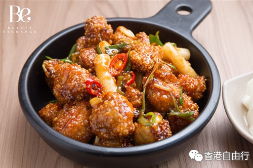 「韩式鸡丁」(HK$140) 与普通烤鸡不同,这款是菜式採用的是已经拆骨的鸡肉部份,外层的脆米包裹著鸡肉,配合韩式辣酱,咬下去外脆内软!