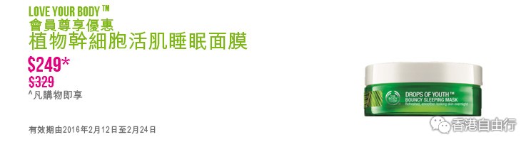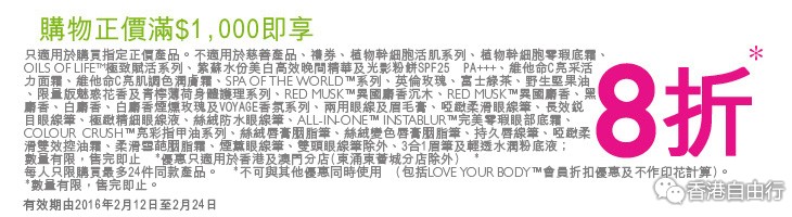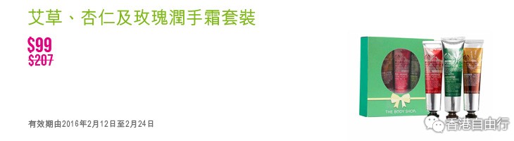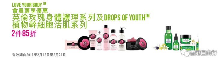 2016-02-13 微信红包微币天天送,关注微信号: hkziyouxing (长按左边红色字复制)获取福利和最新香港购物优惠折扣信息THE BODY SHOP 最新店内优惠(至16年2月24日)