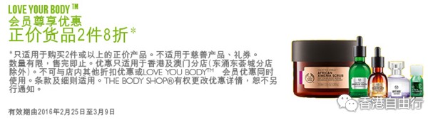 2016-02-25 微信红包微币天天送,关注微信号: hkziyouxing (长按左边红色字复制)获取福利和最新香港购物优惠折扣信息香港打折:the body shop最新店内优惠推广(16年2月25至3月2日)