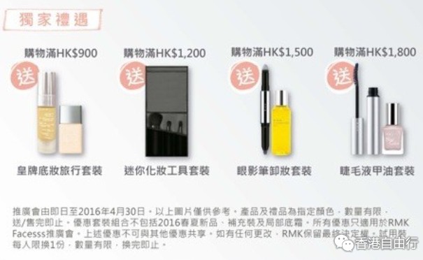 2016-03-02 微信红包微币天天送,关注微信号: hkziyouxing (长按左边红色字复制)获取福利和最新香港购物优惠折扣信息香港打折:RMK Facesss 全新皇牌底妆推广会购物优惠(至16年4月30日)